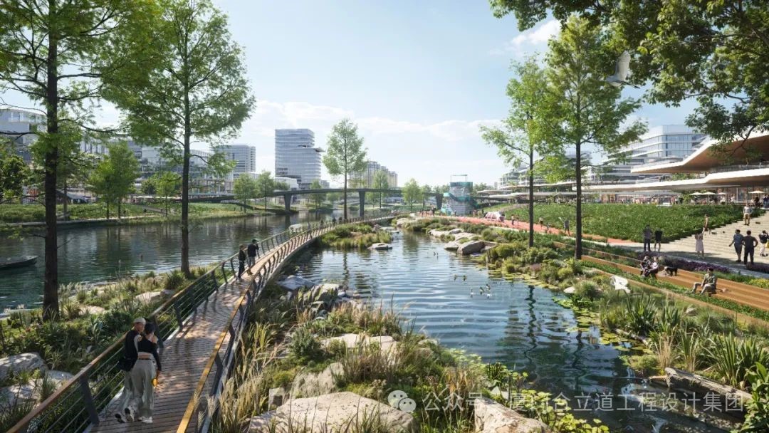 · 科創(chuàng)水廊:遵循“營城先理水”理念,依托現(xiàn)狀水系構(gòu)建韌性海綿系統(tǒng),并利用生態(tài)護(hù)岸、智慧雨洪管理等技術(shù)修復(fù)河道。水廊與周邊地塊相互滲透,植入商業(yè)、文化、休閑、運(yùn)動(dòng)等復(fù)合業(yè)態(tài),形成科創(chuàng)溪谷、人文趣灘、智匯綠洲三大特色區(qū)段。